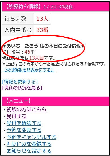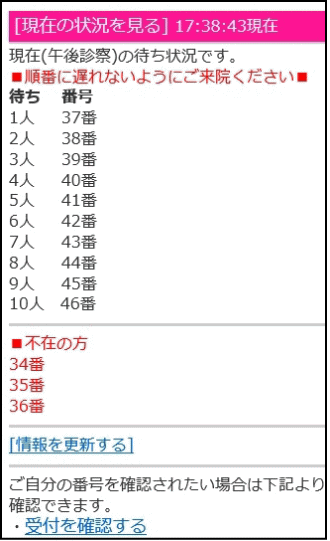 以外な落とし穴! 順番通り来院されない方、キャンセルされる方に要注意 ◆案内中番号ではありません◆ ◆「あと何番目」を明確に◆ 順番通り来院されない方が増えることで、来院パターンが平準化されず、 受付対応が繁雑になります。 もちろんメール配信・電話コールは、ご利用になれますが、 チェックオンの特徴的な機能をご紹介します。 「現在の状況を見る」もしくは、あと何番目を端末に記憶させます。